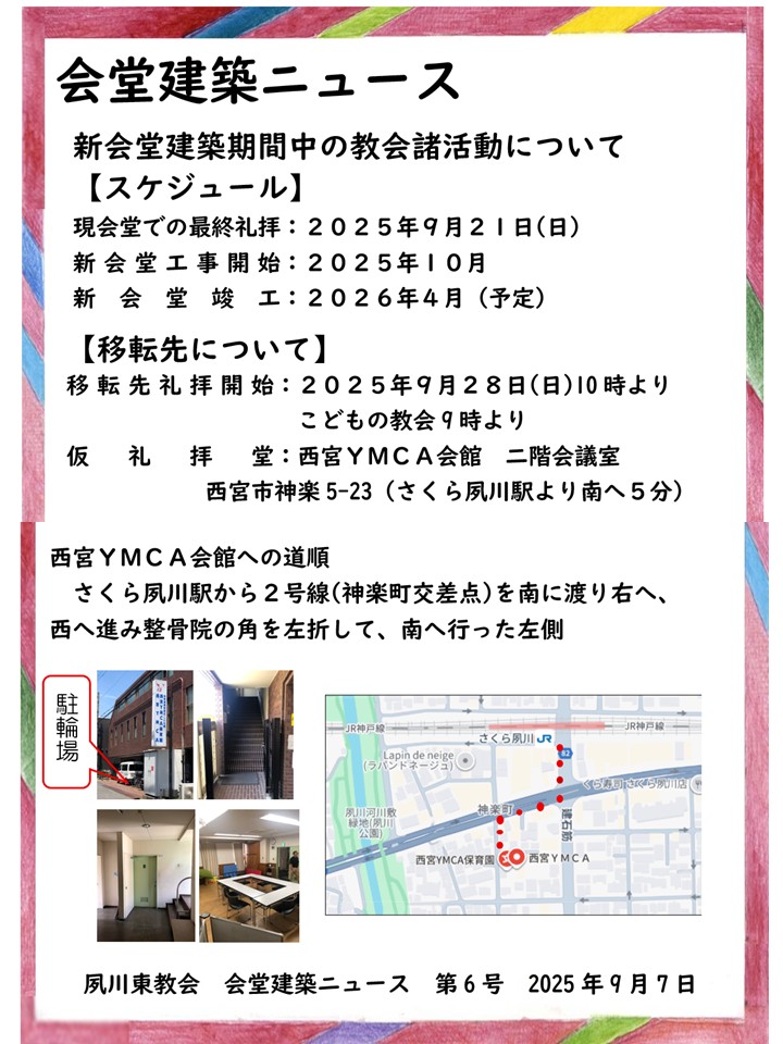 礼拝案内 9月28日より西宮YMCA会館で礼拝開始 Posted by 夙川東教会 on 2025年9月14日 次の記事 → 未分類 夏期こどもの教会合同礼拝のご案内 礼拝案内 3月23日創立66周年礼拝&賛美音楽会 礼拝案内 10月12日 神学校日礼拝・講演会のお知らせ 礼拝案内 夙川東教会 次の記事 → 未分類 夏期こどもの教会合同礼拝のご案内 礼拝案内 3月23日創立66周年礼拝&賛美音楽会 礼拝案内 10月12日 神学校日礼拝・講演会のお知らせ